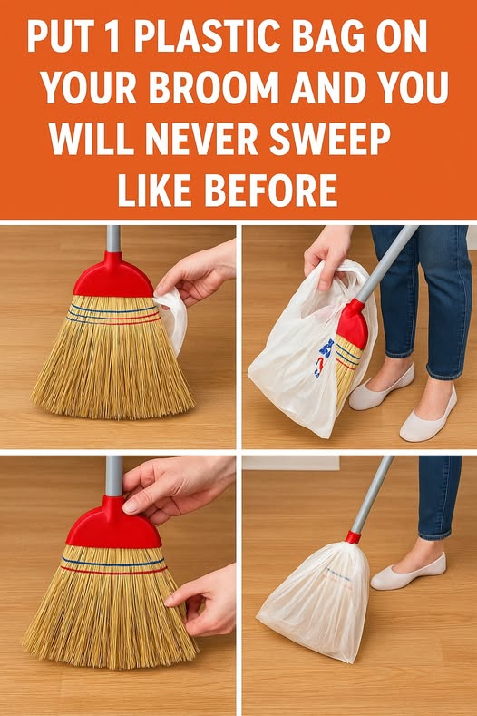 Placing a plastic bag on your broom is a genius domestic maneuver that acts like a “targeted-static-and-debris-shield” for your floors. This ritual is a treasure because the static electricity generated by the plastic “shocks” fine dust and hair into “rapid attraction” while the physical barrier “shatters” the “roots” of broom-bristle clogging and tangled messes. It is a smart and 100% natural way to “erase” persistent pet hair, “ignite” a “rapid” surge in cleaning efficiency, and “shield” your broom from “unwanted” dirt buildup, leaving your “home” feeling “unbreakable” and “rejuvenated” instantly.